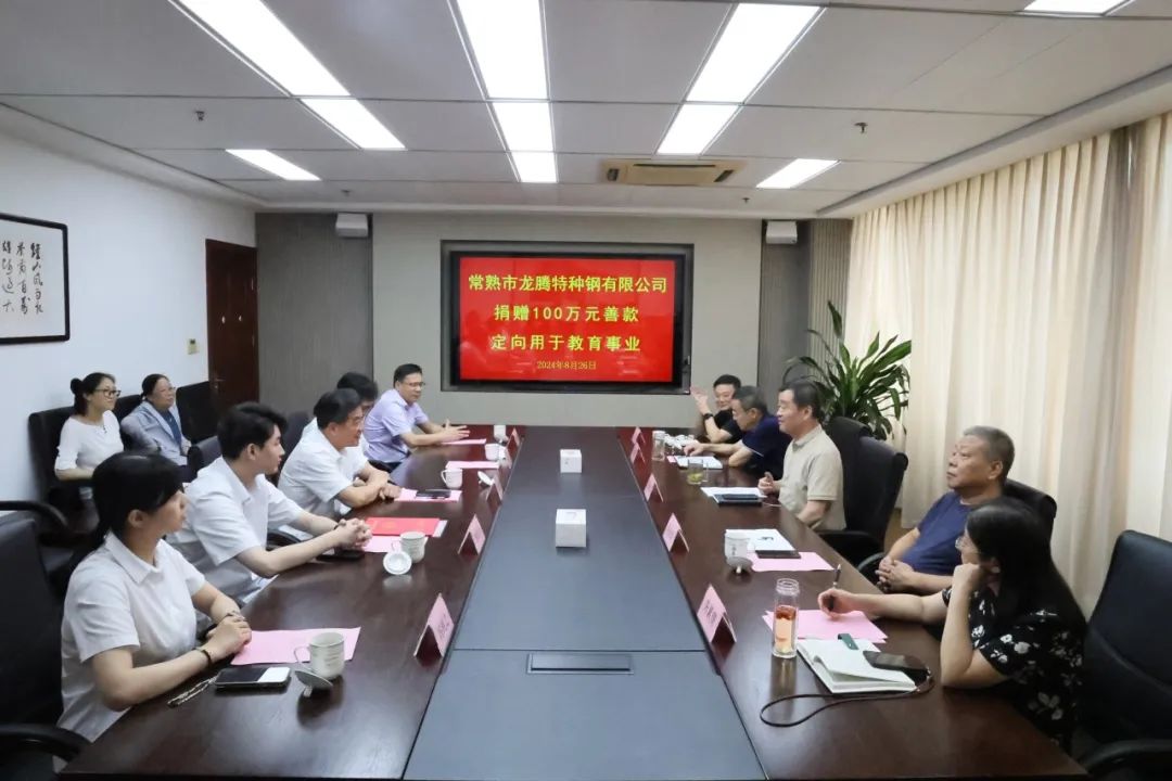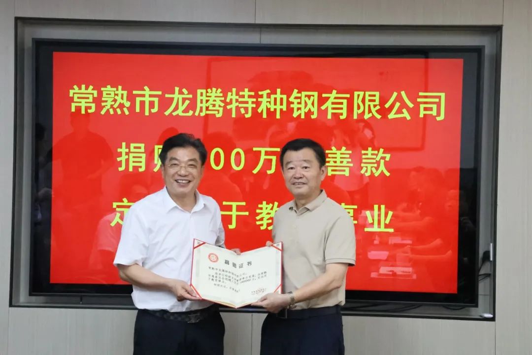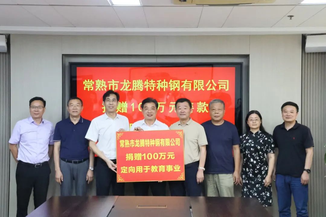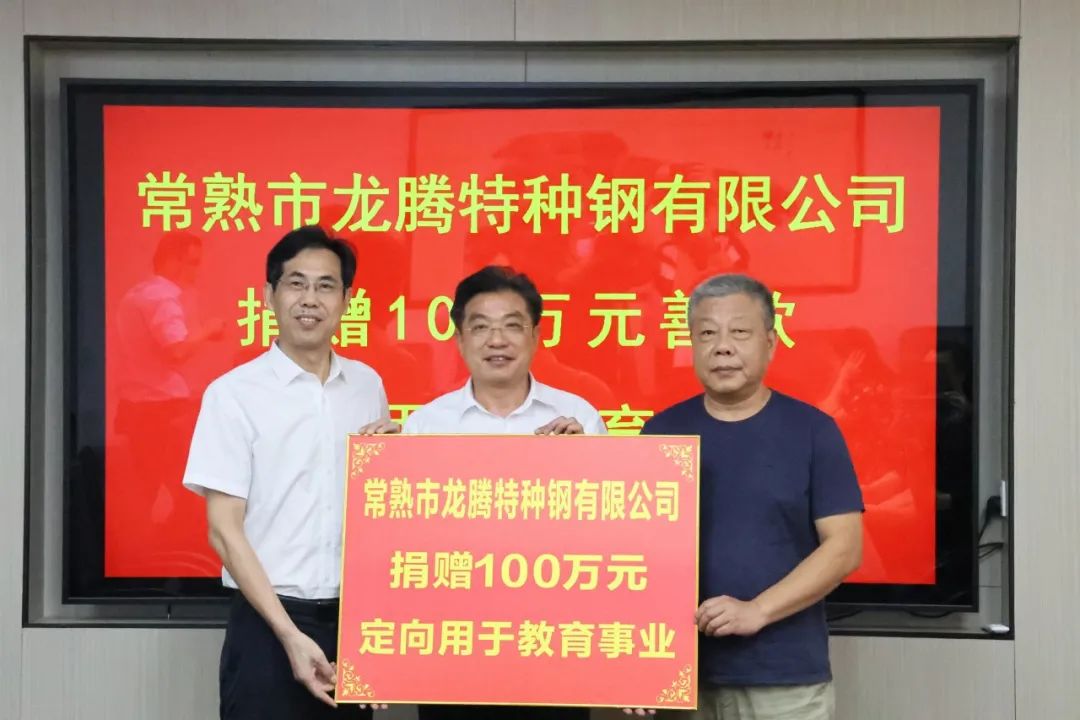 8月26日,常熟市龍騰特種鋼有限公司捐贈(zèng)善款100萬元,定向用于常熟市中學(xué)教育事業(yè)。