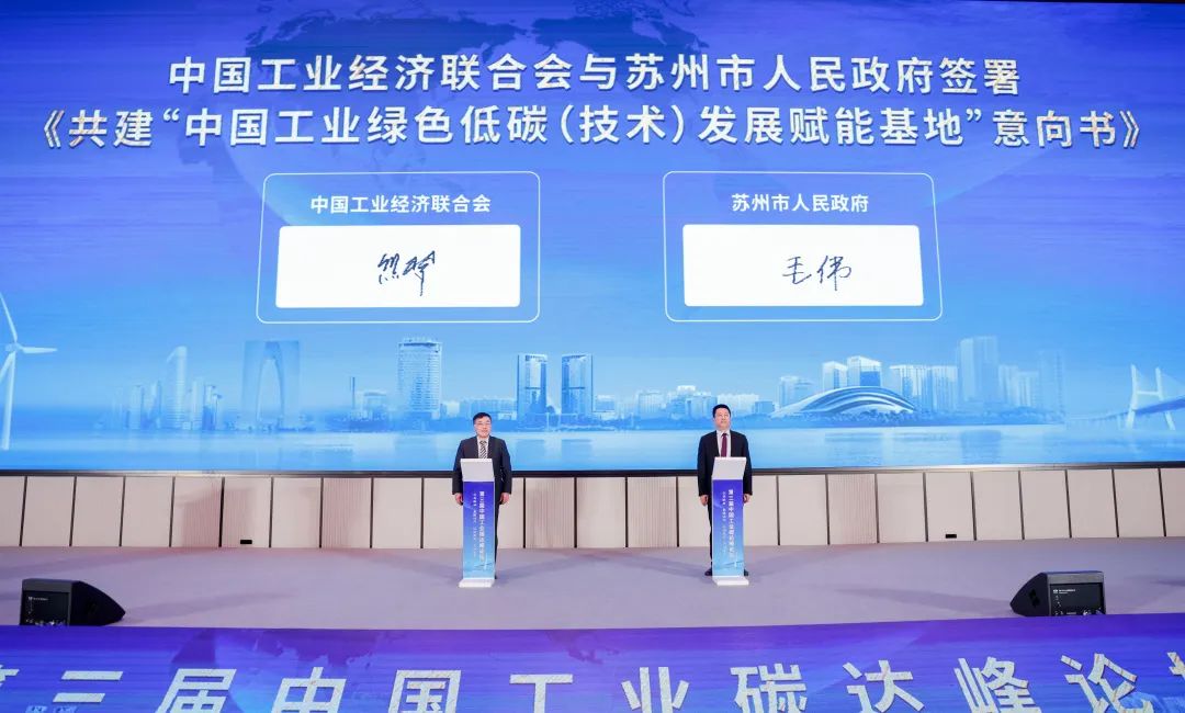 在與會嘉賓的見證下,中國工業(yè)經(jīng)濟聯(lián)合會和蘇州市人民政府簽署《共建“中國工業(yè)綠色低碳(技術)發(fā)展賦能基地”意向書》。賦能基地依托蘇州已有產(chǎn)業(yè)基礎以及中國工業(yè)碳達峰“領跑者”企業(yè)的綠色技術產(chǎn)品和整體解決方案,以需求為導向,助力蘇州構建綠色低碳(技術)發(fā)展創(chuàng)新體系,夯實蘇州融合產(chǎn)業(yè)發(fā)展基礎,共同在長三角地區(qū)打造工業(yè)綠色低碳發(fā)展的新高地。